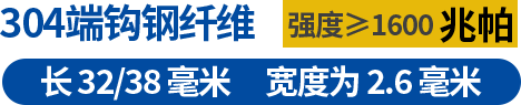 特点:304端钩型钢纤维具有优异的性能,包括高强度、高韧性、良好的高温强度和高温耐腐蚀性,以及与耐火料基体结合力强等特点。 这些性能使得304端钩型钢纤维在多个领域中有着广泛的应用。纤维中含有的耐蚀性贵金属镍(Ni)8-10,铬18-20,赋子了它良好的高温强度和高温耐腐蚀